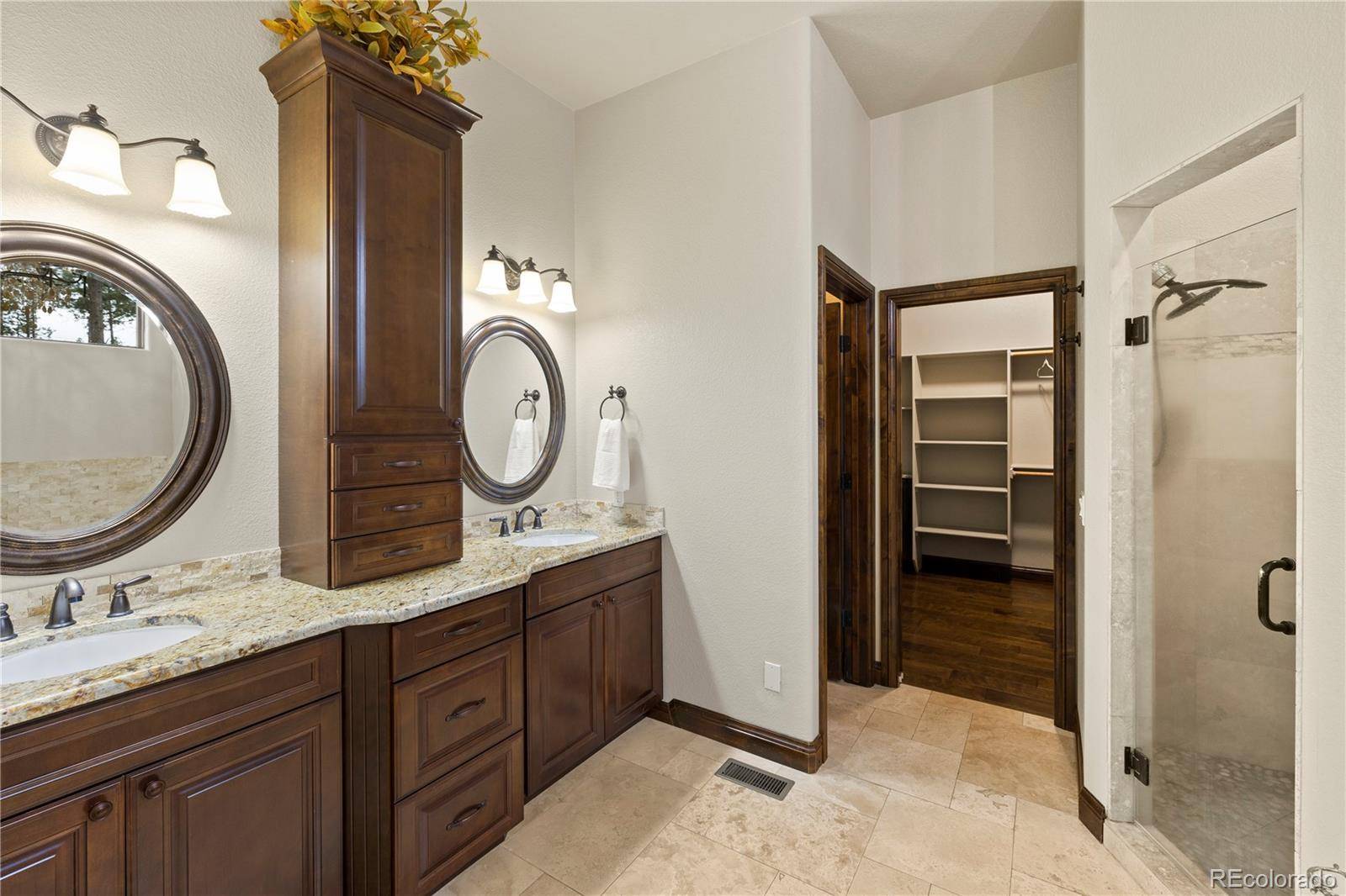Privately situated on 2.75 acres in the gated Black Forest Reserve, this custom ranch-style home blends refined design with peaceful, wooded surroundings. The main level welcomes you with a spacious great room featuring vaulted, beamed ceilings and a striking floor-to-ceiling stone fireplace. The gourmet kitchen offers high-end GE Café appliances, a 6-burner gas range with griddle, double ovens, butler's pantry with wine cooler, granite countertops, and custom cabinetry with soft-close drawers and elegant crown molding. The primary suite is a serene escape with a spa-inspired five-piece bath, shower w/ dual shower heads, an oversized walk-in closet with built-ins, and a separate sitting area. Two spacious bedrooms with built-in shelving & a full bathroom complete the main level. The finished basement expands the living space with a full wet bar, large family room with fireplace, theater space, and two additional bedrooms—one featuring a junior suite with jetted tub and walk-in closet, plus a full bath shared by the others. Rich knotty alder doors, curved iron staircase, hand-selected stone tile, and designer lighting add warmth and character throughout. Step outside to the expansive covered deck designed for year-round outdoor living, complete with tongue and groove wood ceiling, built in gas fire-pit, heaters, & outdoor TV. Surrounded by forest views and backing to open space you can enjoy the full outdoor kitchen w/ built-in Traeger pellet smoking grill, Blackstone cooktop, stainless steel sink, & granite countertops. A finished attached garage is complemented by a detached heated oversized 3-car garage with workshop space. Recent updates include a new roof in 2020, water heater in 2022, & Tesla car charger installed in the garage. A rare blend of luxury, privacy, and nature — minutes from schools, shopping, parks, and the best of Colorado Springs.