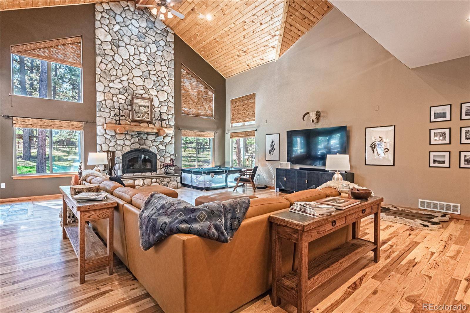 Welcome to a home that defines the Colorado lifestyle! Nestled on a large wooded lot in Larkspur this spacious 6/7- bedroom, 5-bath retreat offers the perfect blend of peace, privacy, and convenience. Step onto the enormous front porch and enjoy your morning coffee while listening to the birds. The custom pewter-relief double front doors open to an expansive open-concept main level featuring a vaulted living room with tongue-and-groove wood ceilings, a dramatic floor-to-ceiling river rock fireplace, and gleaming hickory floors. Large windows frame the treed setting and fill the home with natural light. The kitchen is designed for both everyday living and entertaining with a casual dining area, breakfast bar, double ovens, and ample counter space. A formal dining room provides additional space for gatherings. The main-level primary suite boasts a spa-like 5-piece bath with radiant floor heating, jetted tub and large walk-in closet. Also on the main level is a versatile bedroom/office and a powder room. Handcrafted stair rails lead you upstairs where the open hallway overlooks the living room, enhancing the lodge-like feel. Here you'll find 3 more bedrooms-one with a Jack-and-Jill bath, one with a private bath—plus a versatile loft space. The finished basement is your
