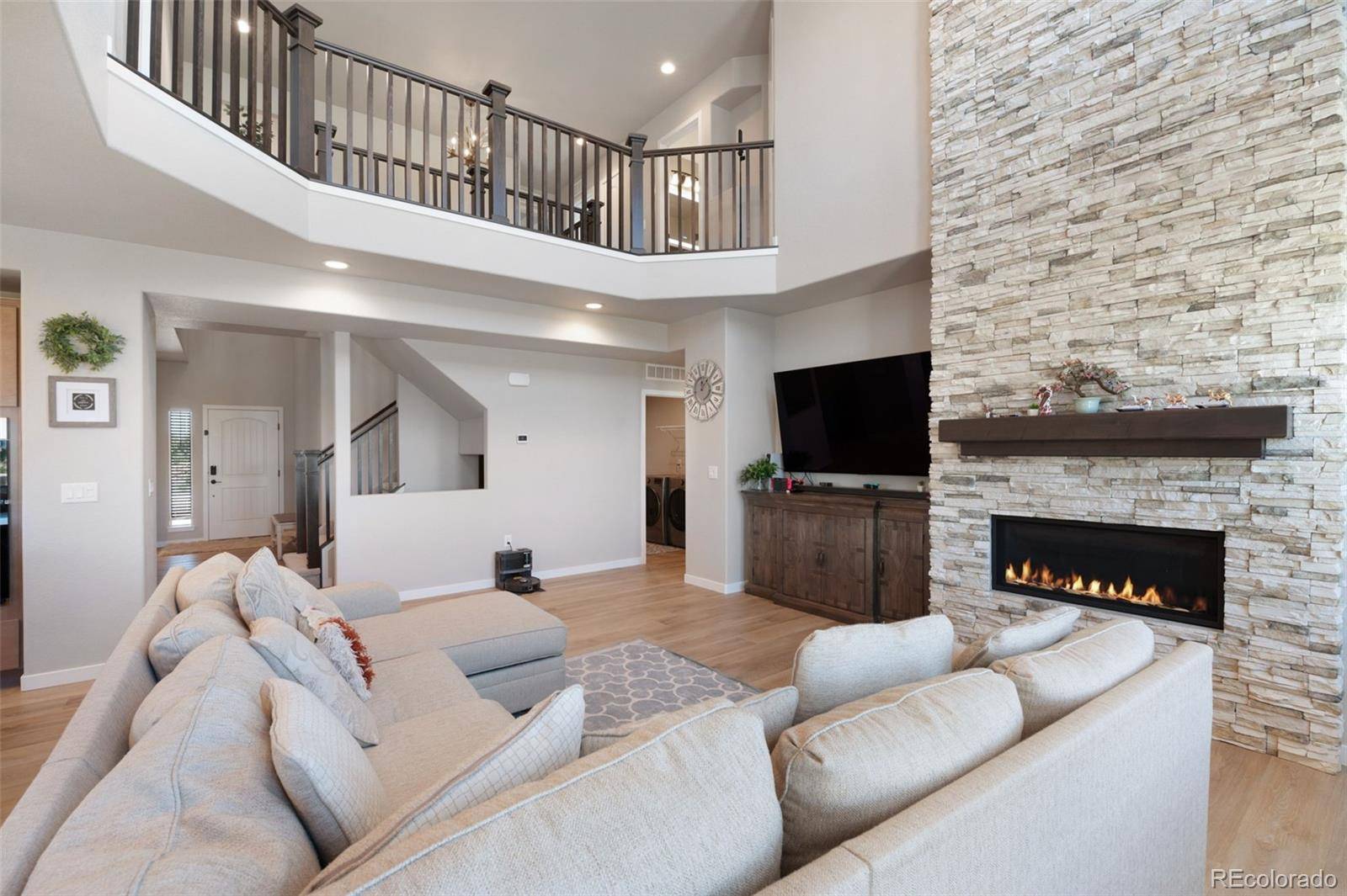 Breathtaking mountain views & a setting that backs to open space make this home truly one of a kind. From the moment you arrive, the scenery takes center stage & continues to impress throughout the entire property. Nestled on a large, newly landscaped lot with added fencing & mesh, this residence combines modern design with thoughtful upgrades, creating a home that is as functional as it is beautiful. Soaring ceilings & expansive windows highlight the views while filling the home with natural light & a dramatic floor-to-ceiling fireplace anchored by elegant chandeliers sets the tone in the great room. The gourmet kitchen is designed for everyday living, featuring quartz countertops, upgraded cabinetry, a walk-in pantry, custom backsplash, modern faucet, & a spacious island that flows seamlessly into the dining & living areas. A versatile front room adds flexibility, whether used as a formal dining space or a cozy sitting area, while the main-level office provides the privacy needed for work or study. Upstairs, the primary suite serves as a relaxing retreat with stunning mountain vistas, a spa-inspired bathroom enhanced by smart mirrors, & a generous walk-in closet. Secondary bedrooms are equally spacious & bright, complemented by well-appointed bathrooms, & an upper-level catwalk enhances the architectural appeal while overlooking the living area below. The unfinished basement presents endless possibilities for future expansion, from a home theater to a fitness room or additional living space. Outdoor living is just as impressive, with a large deck perfectly positioned to capture Colorado's sunsets & mountain views, while the beautifully landscaped backyard is designed for both recreation & relaxation, making it a space to enjoy year-round. Additional upgrades include window well covers, a suite of blinds with motorized options, security cameras with a doorbell camera, & insulated garage walls with utility racks & a slate wall system for added organization.