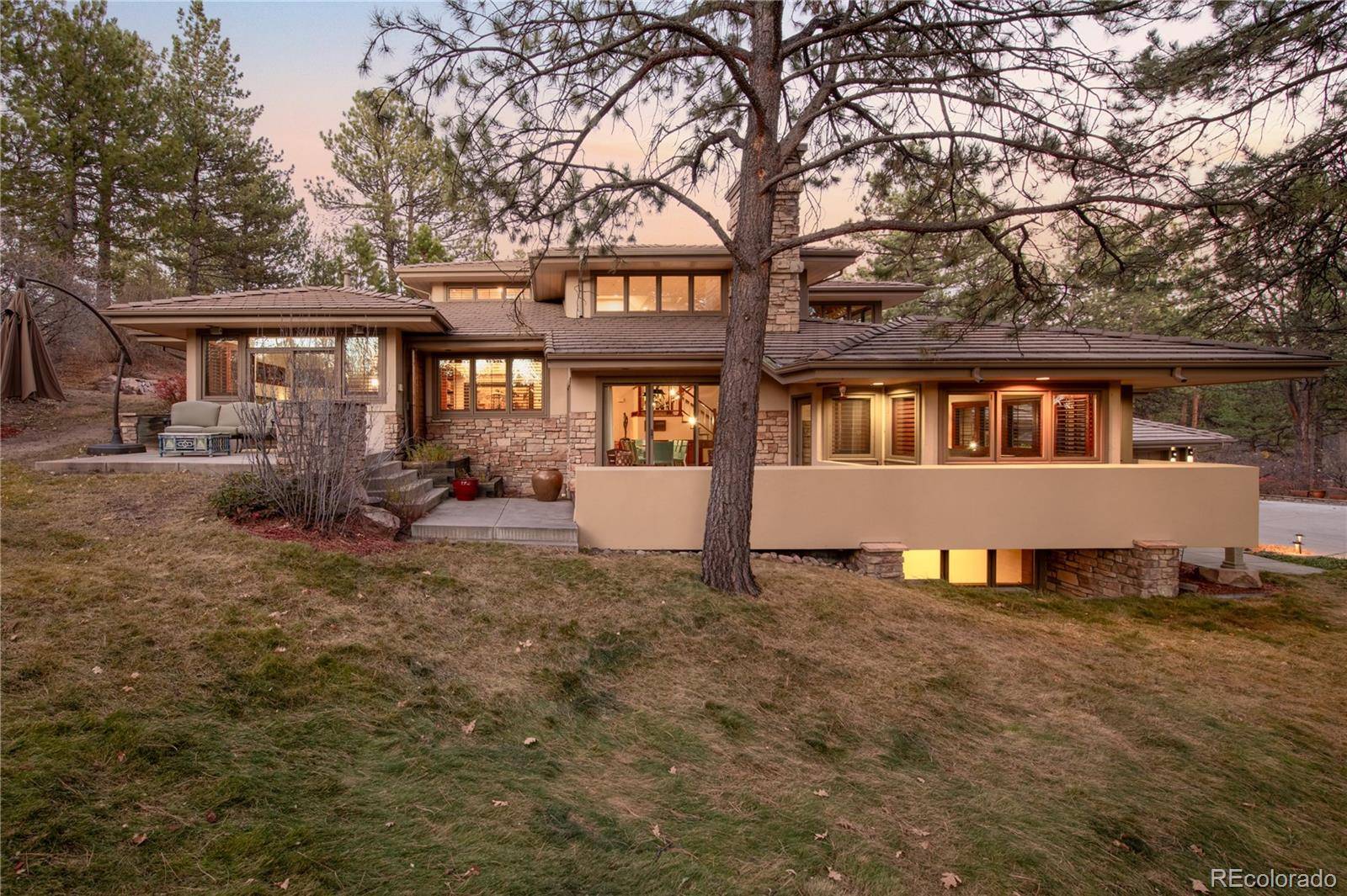 Elevated living meets timeless architectural artistry in this Castle Pines Village masterpiece. Tucked along a quiet, low-traffic street and nestled into the hillside, this residence offers unmatched privacy on a lush, oversized lot within one of Colorado's most exclusive gated communities. A tranquil Japanese waterfall and stream flow beneath a covered walkway, creating a serene first impression and setting the tone for the home's Frank Lloyd Wright–inspired design with dramatic rooflines, broad overhangs, and walls of glass that frame peaceful garden views.